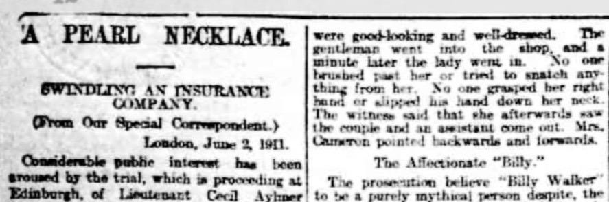The first question they asked was whether Ruby Cameron had ever had such a pearl necklace and whether or not she had “used some other contrivance” to get them insured. Her claim that they had been a gift from “Billy Walker”, who rather conveniently had allegedly gone to darkest Africa. The police argued that even if this was the case then there must be some trace of him, but none could be found. Ruby Cameron claimed to possess letters written by him but the prosecution, having consulted experts, concluded that “the Billy Walker letters were written by Mrs Cameron.” They argued that Ruby Cameron and her husband had borrowed a real pearl necklace from someone or from Carrington’s jewellers whilst in London and had had a mock up made, using the real ones simply to show the insurers. The false pearls they claimed were the ones that Ruby was seen to wear wherever she went out.