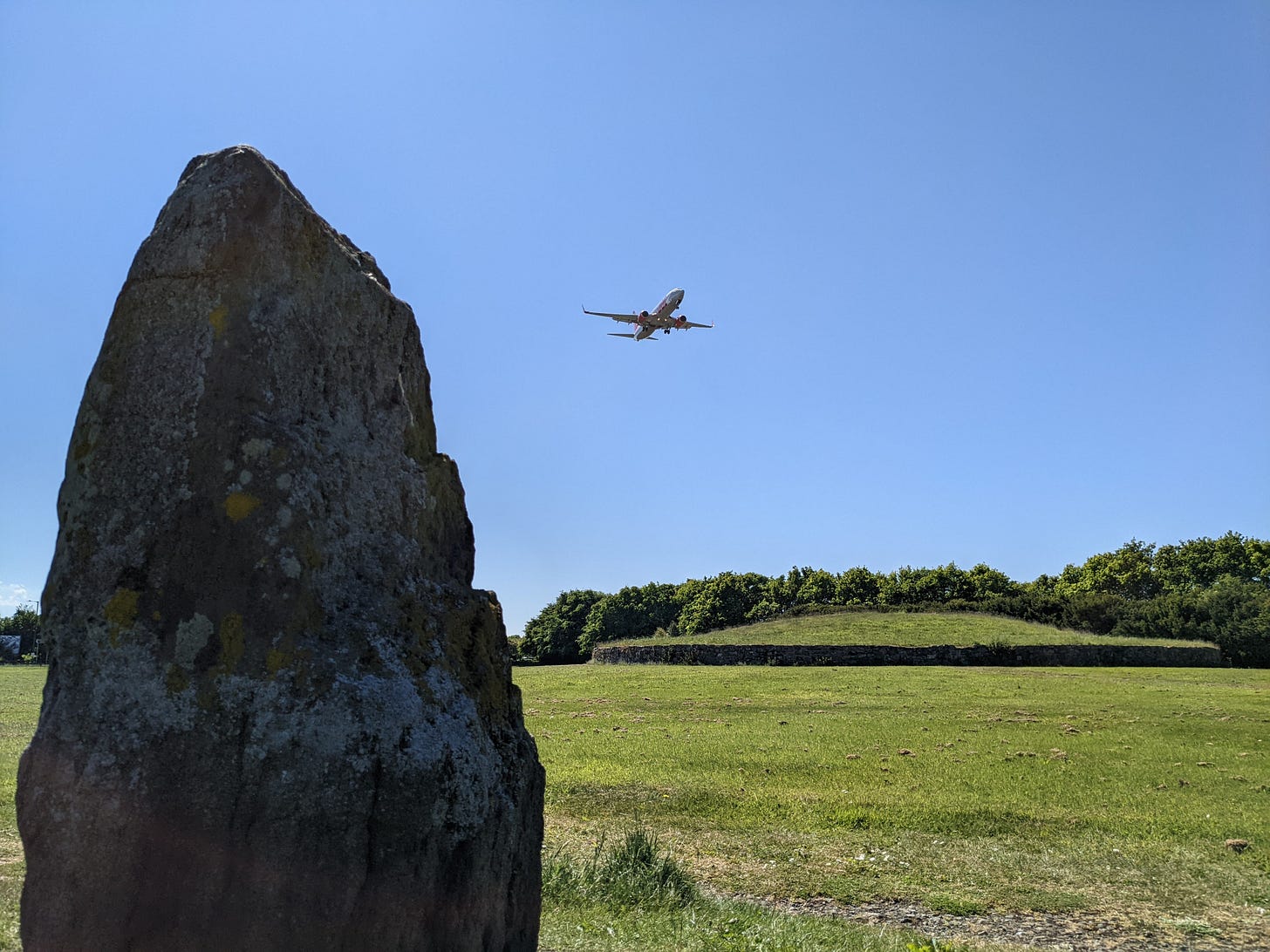 My favourite thing about visiting Huly Hill is that it sits directly beneath Edinburgh Airport’s flight path. The planes pass just a few hundred feet above the cairn, their powerful engines setting its packed earth trembling. Lie down atop the cairn, close your eyes, and contemplate the passing of ages.
