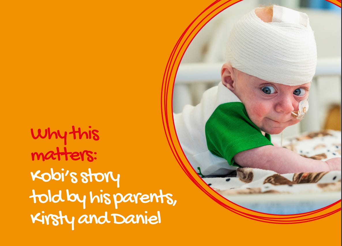 Kobi is younger, born in the summer of 2024, but like Hector was born prematurely – at 26 weeks, when he weighed a few ounces over 3 pounds. He suffered a brain bleed that threatened his young life, and suffered up to ten seizures a day. Now, 16 surgeries later, his struggle continues. He is supported with love by parents Kirsty and Daniel, who live in East Lothian. “Sixteen times we’ve handed him over, not knowing if he’d come back,” they said.